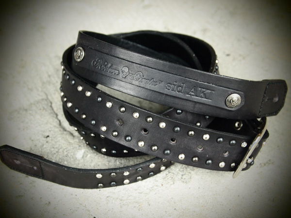 ModernPirates×Sid Aki 001は、明希本人との綿密な打ち合わせの末に生まれたという製品。細身だが厚みのあるガッチリとしたブラックのレザーには、たくさんのミクロスタッズが打ち込まれており、スワロフスキーとともにきらびやかな唐草模様をかたどっている。この唐草模様には“A.K.I”の文字が隠されている。ストラップには数多くのスタッズが打ち込まれているが、しなやかで演奏時に肩が痛くなるようなこともない。ゴージャスだが幅広いシチュエーションで使えるストラップになっている。