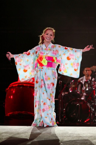 またステージには、毎年恒例のフロートも登場。Aフラッグを先頭に、ハッピ姿のSHU-YAのエスコートを受けて、浴衣に早着替えした浜崎あゆみが、スタジアムを大きく1周。「Sunrise ~LOVE is ALL~」「glitter」「BLUE BIRD」「Greatful days」といったayuの夏歌メドレーで、<a-nation>のお祭り気分は最高潮に達する。