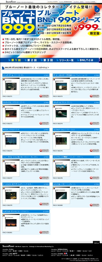 「ブルーノート BNLT 999」シリーズは、2012年7月から9月まで毎月11枚ずつ全33タイトル、各999円(限定盤)で発売しているシリーズだが、最新ジャズ・チャートにおいて、8月22日リリースの第2回発売作品が、ベスト10中8タイトルを占め、残る3タイトルも11~13位と全タイトルが上位を独占している状況なのだ。7月に発売された第1弾11タイトルも全て100位以内にランクインしており、その人気の高さが際立っている(サウンドスキャン調べ2012年8月20~26日)。