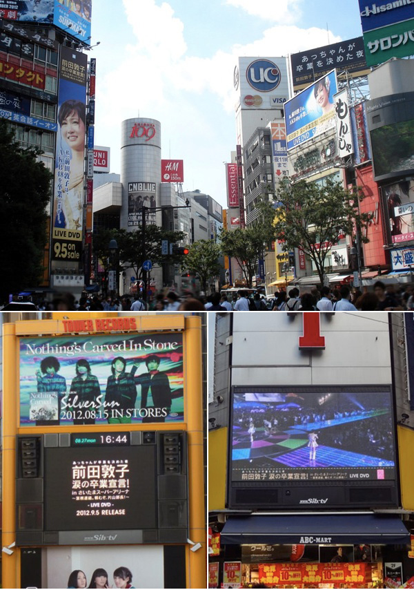 8月24日から3日間にわたって行なわれた東京ドームコンサート、さらに翌27日、AKB48劇場での卒業公演。劇場のある秋葉原はもちろん、世の中は前田敦子のAKB48卒業で一色となったが、渋谷では現在、前田敦子のビルボードやビジョン映像がさまざまな場所に出現。道行く人が足を止めビルボードを眺めたり、写真を撮る姿が目立っている。