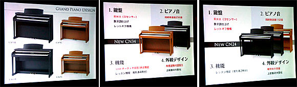 ▲新モデルは鍵盤や音源、ペダルなどを一新。CA95、CA65、CN34、CN24に加え、コンパクトなES7と同社のデジタルピアノのラインナップの多くを新製品が占めることとなった。