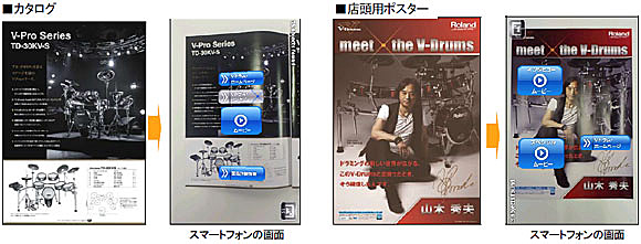 今回AR対応印刷物として展開するのはVドラム総合カタログ(2種)、販売店店頭用ポスター(3種)、雑誌広告(2種)。カタログには製品の詳細情報や独自テクノロジーの解説ホームページ、ポスター/雑誌広告では日本屈指のドラマー、山木秀夫やレミオロメンの神宮司治のスペシャル・ムービーへのリンク・マーカーをそれぞれ設置。画面内の複数のコンテンツから、見たいものを選んで素早くアクセスすることができる。