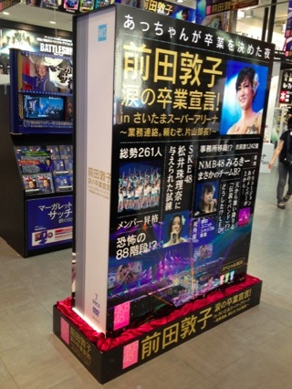 9月5日に発売され、オリコンDVD総合デイリーランキング初日から2日連続で1位を獲得した、AKB48のライブDVD『前田敦子 涙の卒業宣言!in さいたまスーパーアリーナ ~業務連絡。頼むぞ、片山部長!~』。渋谷の街が卒業宣言をする前田敦子のビジュアルで一色となる中、SHIBUYA TSUTAYAには高さ180cmにのぼるスペシャルBOXの大型レプリカの展示がスタートしている。