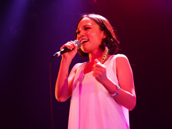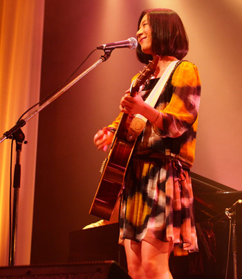 そして、ギターを持って華やかに登場した植村花菜は、前半の流れを汲むようにアコースティック・ソウルな「ミルクティー」からスタート。4月から6月にかけて米国へ一人旅に出たエピソードを曲間で話しつつ、「世界一ごはん」「メッセージ」など力強さを増した新作『手と手』の収録曲を中心に、ピアノだけをバックにしたシンプルな編成で次々と披露。最後は“大切な人を思い浮かべながら聴いて下さい”と名曲「トイレの神様」を情感たっぷりに聞かせ、旅を経てリフレッシュした歌声を久々の地元に響かせた。
