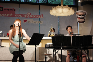 ライブゲストの二番手、土岐麻子はサポート・キーボーディストの川口大輔とともに登場。「Gift~あなたはマドンナ」、10月発売のニュー・アルバム『CASSETTEFUL DAYS ~Japanese Pops Covers~』から、「Hello, my friend」(松任谷由実カバー)、「イージュー★ライダー」(奥田民生カバー)と計3曲を披露。優しく柔らかな歌声に場内は酔いしれた。また、番組パーソナリティMISATOとのトークでは、「元気を出したい時の自分へのごほうびは、甘いものを食べるのが一番効果的、すぐ機嫌が良くなる。ささやかな贅沢です」と語った。