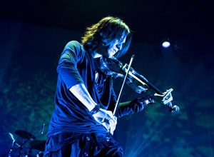 そしてギターをヴァイオリンに持ち換え、ソロを奏でると男性ファンからも熱狂的な歓声が起こり、ヴァイオリンの音色と鍵盤が美しい「MIRANDA」に移行し、“楽園”へと連れていかれる錯覚を覚えた。そこから、攻撃性と深い悲しみ、祈りが渾然一体となった代表曲の1つ、「ENOLA GAY」へと。炎が燃えさかるようなソロを響かせ、エンディングで“もう戦争はたくさんだ”と言わんばかりに頭を抱えこむSUGIZO。再び映し出される“NO MORE NUKES PRAY TO MUSIC”のメッセージ。が、言葉がなくても十二分に伝わるのが彼の音楽のスゴイところだ。むしろ、言葉に縛られない分、イマジネーションはどこまでも広がっていく。続いて15年前の1stアルバムからのレアトラックであり、今回は類家心平によるインプロヴィゼーション・トランペットを大々的にフィーチャーした「KIND OF BLUE」が披露され、オーディエンスは久々に耳にする強力生ドラムンベース・トラックに身を委ね歓喜した。