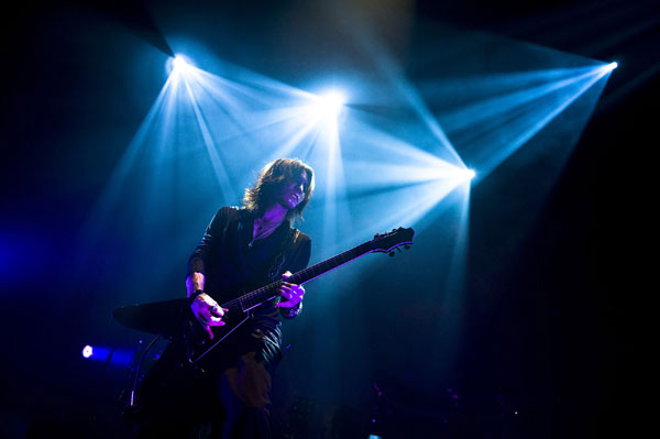 ライヴは後半に行くに従って、熱を帯び、 “NEO COSMOSCAPE”ではスタッフに抱きかかえられたSUGIZOがステージ後方の壇上にのぼり、パーカッションを叩く場面も飛び出した。骨折して歩けない状態にも関わらず、自らの音楽に絶対に手を抜かないその姿勢と情熱に改めて驚かされ、動と静のコントラストが絶妙な「FOLLY」、サイケデリックでジャジーかつヘヴィファンクなトランス・チューン「DO-FUNK DANCE」となだれこみ、衝動を抑えきれず、ついに上手、下手へと足をひきずりながら歩いてギターをかき鳴らす。そして本編ラストの「TELL ME WHY?」(Ending Part)で赤坂BLITZは完全に昇天。まさにライヴタイトル通りのアセンションである。