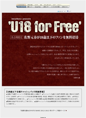 2012年12月からスタートする佐野元春&コヨーテ・バンドの全国ホールツアー<WINTER TOUR 2012 -2013>にて、6歳から18歳までの学生・社会人のチケット代を無料にすると発表した。
