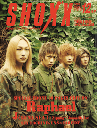 鈴木:そう。Raphael初表紙。『SHOCK WAVE』(SHOXX主催の対バンライヴツアー)で、昔、Janne Da ArcとILLUMINAとRaphaelでまわるっていうタイミングのときに、Janne Da ArcとRaphaelの対談で表紙巻頭特集を組んだんだけど、そのときyasu(現在はAcid Black Cherryとしても活躍中)とYUKIの2人で表紙をやったことがあったんだけど、Raphaelとしての表紙は初だったね。その表紙のときに、ソルジャーをテーマに、猿島に行ってロケしたんだよ。武道館ライヴ(2000年3月4日)を終えて、第二期Raphaelの第二章でもあったこのシングルで、満を持しての初表紙ってことで、いままでとは違う見せ方をしようっていうので、無人島に行って、迷彩服を着て、ジャングルの中で泥だらけになって匍匐前進した写真を撮って。