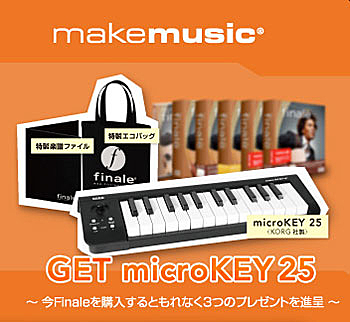 エムアイセブンジャパンは、楽譜作成ソフトウェア「Finale 2012」購入で、特製エコバッグ、特製楽譜ファイル、MIDIコントローラーのKORG microKEY 25をプレゼントする「GET microKEY 25」キャンペーンを期間限定で開始した。また、「Finale 2012」のクロスグレード版の販売も開始した。