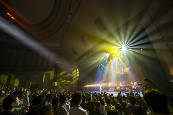 まずは、記念すべき初日のトップバッターを飾ったFIELD OF VIEW。今回のツアーのためにオリジナルメンバーの浅岡雄也(Vo)と安部潤(Key)が再び集い、1990年代の音楽シーンを彩ったあの透き通った音色を奏でる。<突然の風に吹かれて 夢中で何かを探したね>。オープニングナンバーの「突然」は、当時CMソングとして使われていたポカリスエットのTVコマーシャルの映像が懐かしく甦ってくる。さらに続いた「ドキッ」、「FIELD OF VIEWのシングル曲をメドレーにしてきたので、ぜひ心の中で大合唱して下さい」と浅岡が曲紹介した、「Dreams」「青い傘で」「この街で君を暮らしたい」「Beautiful Day」「Last Good-bye」と続いた5曲のスペシャル・メドレー。そして、エンディングを飾ったデビューシングル「君がいたから」と、この日の彼らが奏でた音色はどれも、前述のポカリスエットのCM映像でも印象的だった晴れ渡る青空のような清涼感を放つ。今日は皆さんと伝説の目撃者になって、新しい伝説を作っていきたいと思います。浅岡のMC通り、新たな“LEGEND”の幕開けを飾るにふさわしい盛り上がりで<BEING LEGEND LIVE TOUR 2012>はスタートした。