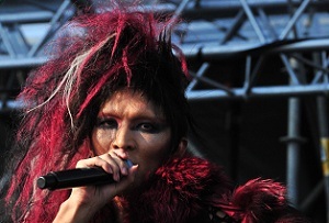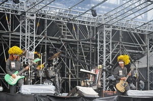 2日目は前日とは打って変わって雨模様。そんな中、「BE MY BABY」のSEに乗ってステージに現れた氣志團。「MACHINE」や「One Night Carnival」「俺達には土曜日しかない」といったお馴染みのアゲアゲな楽曲でヒートアップし、悪天候を忘れさせてくれるほどの楽しいステージを展開した。2番手はPOLYSICS。BUCK-TICKへのトリビュート曲「Sid Vicious ON THE BEACH」の時にPOLYSICSのメンバーと同じグレーのツナギとサングラスを着用した今井寿と樋口豊がステージに登場! 初日同様、2日目もこういった貴重なコラボを目撃することができた。N’夙川BOYSは「EMPTY GIRL」でメンバー3人が演奏中に次々とパート(楽器)を替えていくなど、自由度の高いパフォーマンスを見せてくれる。マーヤLOVEが客席のエリアにダイブを試みたり(結果的にはスタッフに止められたが…)、暴走気味のステージがオーディエンスに大きな衝撃を与えたのではないだろうか。Pay money To my Painも「love letter」で今井寿とのコラボを実現。破壊力のあるPTPのサウンドに今井寿のギターが加わったことで迫力が増し、そして華やかさも感じ取れた。AA=は1曲目にトリビュート曲「M・A・D」をハードなアレンジで聴かせ、オーディエンスを圧倒。MCでは「アニィ(ヤガミ・トール)の髪型が天に向かってバクチクしている間はやり続けてほしいと思います」とBUCK-TICKのメンバーに向けてエールを送った。続いて登場したのは1983年結成のD’ERLANGER。BUCK-TICK以上の長い歴史を持つだけに、その風格と貫禄はまさに圧巻!! しかもサポートメンバーとしてSOPHIAの都啓一が参加し、5人編成のステージとなった。しかし、それだけではなかった。途中でDIR EN GREYのDieが加わり、最初で最後かもしれない6人編成で「LA VIE EN ROSE」「ICONOCLASM」を聴かせてくれた。