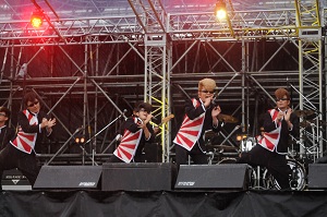 フェス初日。天候が心配されたが晴れて気温も高め。そんな中、トップバッターとして登場したのはMERRYだった。いきなりBUCK-TICKの「真っ赤な夜-Bloody-」のカバーを披露したほか、中盤でもトリビュート盤でカバーした「悪の華」を演奏するなど、BUCK-TICKへのリスペクトを感じさせるステージだった。続いて登場したMUCCは「JUPITER」や「蘭鋳」など5曲を披露。独自の空気感を作り出し、「風と太陽」ではオーディエンスがタオルを回し、ステージとの一体感を味わった。cali≠gariのステージでは6曲目の「MISTY ZONE」でBUCK-TICKの今井寿が一角獣のかぶりものでステージに登場! コラボ演奏のかっこ良さはさすがであった。 4組目のBREAKERZはトリビュート盤でカバーした「JUST ONE MORE KISS」を含め、全5曲を聴かせてくれた。BUCK-TICKの今井寿がいつも左の頬に“B-T”とペイントしているが、DAIGOは左頬に、AKIHIDEは手の甲に、SHINPEIはお腹に、“B-T”ならぬ“B-Z”マークをペイント。こんなところにもリスペクトを感じさせてくれた。和やかな雰囲気のBREAKERZの後、L’Arc~en~Cielのyukihiroのプロジェクト、acid androidが登場し、クールなステージパフォーマンスを展開していく。演奏曲は「unsaid」「violator」「let’s dance」など全6曲。クールな中にある“熱さ”もしっかりと伝わってきた。続くTHE LOWBROWSはバンドとは違う魅力で会場を盛り上げる。途中、機材トラブルがあったが、修繕するまでの間、オーディエンスが手拍子で彼らを応援していたのがとても印象的だった。後半、再び今井寿が登場し、「スピード」でのコラボを実現させたところも大きな見どころのひとつ。