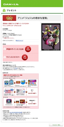期間中にデンモクにログインしてランキングバトルで課題曲「ジョジョ~その血の運命(TV-Size)」を歌うと抽選で3名様に声優サイン入り台本、7名様にサイン入りポスターが当たる!