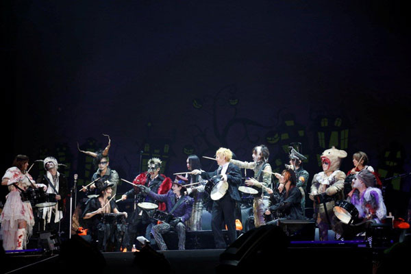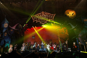 最後を飾ったHALLOWEEN JUNKY ORCHESTRAでは、出演者全員が再登場し、HYDEの気まぐれな指揮による「Penalty Waltz」や、アフリカの子供たちの遊びをもとにしたリズムゲームを披露。さらにこの日は、BREAKERZの「オーバーライト」をHYDEとyasuが歌うというサプライズも。ラストにはTommy february6や3年連続の出演となる青木隆治も登場し、全員でお菓子を投げ配りながら『HALLOWEEN PARTY』を熱唱。