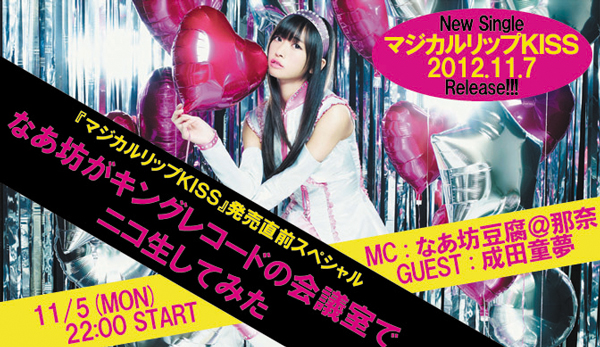 なあ坊豆腐@那奈が新曲「マジカルリップKISS」の11月7日発売を記念して、スペシャル番組『なあ坊がキングレコードの会議室でニコ生してみた』をニコニコ生放送にて放送することが決定した。