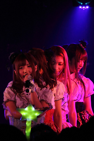 激しい2曲の直後には、みんな息を切らしながらのライブでのお約束、告知コーナー。レギュラー番組について話を振られたかみしおは、「えーっと、『クロちゃんのAKIBAでダイブ!……?』」と、なんだか不安そうですらある。ちなみに偶数週の木曜日に@TVで生配信されている同番組は、安田大サーカスのクロちゃんをメインMCに、me-me*がレギュラー出演している。