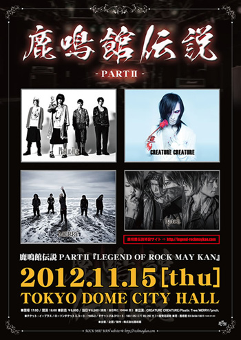 Plastic Tree、Creature Creature、MERRY、lynch.というそうそうたるバンドが一堂に会するイベント<鹿鳴館伝説PART II~LEGEND OF ROCK MAY KAN>が、2012年11月15日(木)に東京TOKYO DOME CITY HALLにて開催となる。