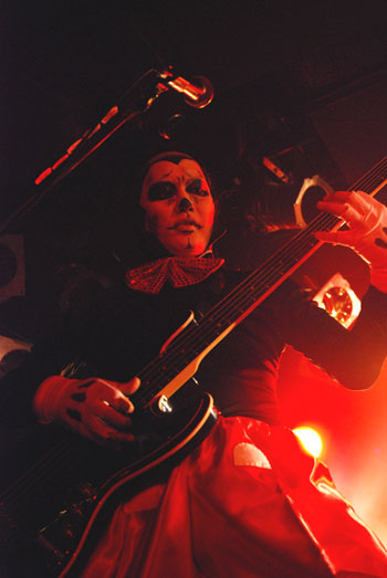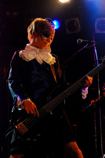 17時30分、ステージ前面に張られた暗幕が落とされた。トップを飾るバンドはν[NEU]だ。海賊風のЯel(Dr)、スヌーピーに扮したヒィロ(B)、白鳥姿の華遊(G)、“呪われた花嫁”がコンセプトだという吐血&振り袖姿のみつ(Vo)が、荘厳なパイプオルガンの音色をバックに登場した。そのSEが聞き覚えのある勇ましいテーマに変わり、颯爽と姿を現したのが仮面ライダー姿のタクミ(G)だった。それも仮面ライダーのマスクを脱いだら、顔面に仮面ライダー・ペインティングが施されているというマトリョーシカ状態。期待通りのド派手な仮装で場内が大爆笑に包まれた。