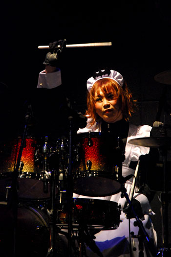 続いての登場はGOTCHAROCKA。元VIDOLLのヴォーカリスト樹威、元PhantasmagoriaのギタリストJUN、元しゃるろっとのギタリスト十夜といった強力なメンツを中心に結成された新バンドだ。アニメ『銀魂』主題歌が流れるステージに十夜とテロが登場した。そのSEが『黒執事』の主題歌に移り変わってベーシストの真悟、『るろうに剣心』の主題歌が流れるとJUNがそれぞれのコスプレ姿で登場した。彼らの仮装コンセプトは言うまでもなくアニメ縛り。そして『エヴァンゲリオン』の主題歌が流れ、恥ずかしげに登場したのが、膝上スカート姿の綾波レイ=樹威だった。場内の驚きと歓声をかき消すように、間髪入れずドラマーのテロがカウントを刻む。ガツン!と響く音の塊は「Gotcha6ka」のイントロだ。強靱なリズムにのって髪を振り乱す樹威。荒波のような音のウネりに合わせて、客席も鼓動するように激しい。シャッフル・ビートが重厚に躍動する「2032」、タテノリのソリッドなリズムが心地好い「JapaneseQ」とタイプの異なるナンバーを次々と繰り出して、さすがの演奏を聴かせてくれた。