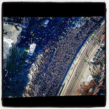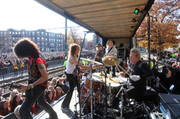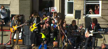 今回、ボストン市全面協力のもと、一般の市道を封鎖して、巨大トラックで作ったステージを設置。通常スタジアム・ライヴを行なうエアロスミスにとっては信じられないくらいの小さな狭いステージでの超レア・パフォーマンスとなった。会場は、当日の朝に発表されたにも関わらず、数万人のボストン市民で埋め尽くされ、現地時間の正午にスタート。ボストン市長のトム・メニーノ氏がバンドを呼び込み、エアロスミスのメンバーが登場した。