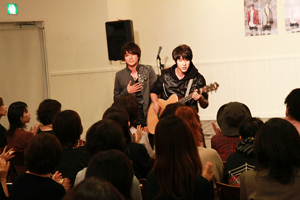 ミニライヴのコーナーでは、「茜」「青にのせて」「抱きしめたい 抱きしめたい」「雨粒パール」の4曲。「青にのせて」では1コーラスを場内で合唱するなど、一体感も味わえた。新曲の「抱きしめたい 抱きしめたい」は、二人が歌詞の中に流れる深い愛情を場内のファンに伝えるように優しく歌い上げた。エリックいわく「宗彦っぽい(笑)」というフレーズ「♪愛の毛布で君を抱きしめたい」など、とても甘い歌詞が乙女心をくすぐるナンバー。
