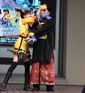 11月11日(日)13:00、キッズ・ファミリーを中心に1500人以上が集まった東京ドーム横ラクーアガーデンステージに、突如こわーい妖怪キョンシーが現れた。襲われそうになった子供たちの泣き声が響く中、川島海荷道士が現れキョンシーを封印!