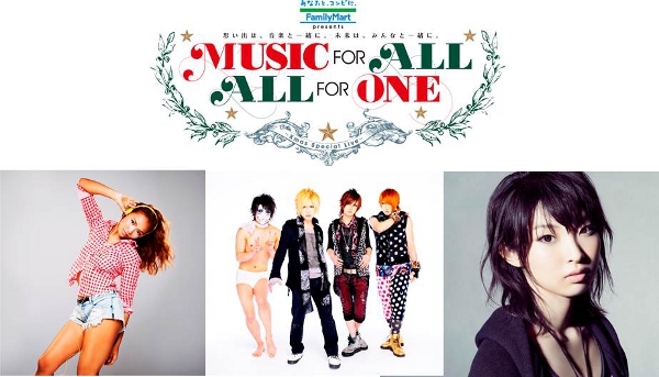 <FamilyMart presents MUSIC FOR ALL,ALL FOR ONE>は、レコチョク主催の元、各レコード会社や音楽メディアが協力し合い、レーベルを越えたアーティストが一堂に会するライブイベント。2011年は「忘れちゃいけない年の、忘れられないクリスマス」というコンセプトで、出演アーティストは3日間に渡って「音楽」を通じて力強くメッセージを発信し、次の年につながるパワーを全国に届けた。