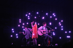 聴く人たちの心の中にいくつもの過ぎ去った夜を想い出させるようなノスタルジックで温かいバラード「おやすみ」から、寝静まった街並みを象やキリンたちが闊歩するファンタジックなCG映像へと移行する展開も、彼ららしく、スパンコールのショートパンツに着替えた吉岡が“爽やか女子”とは違うオトナな顔を見せるシャッフルのレトロなナンバー「恋詩」も新鮮! 鳥たちが飛び立つ映像とシンクロさせた名曲「ブルーバード」もアリーナならではのスケール感で響かせた。