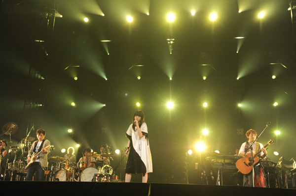 この日のオープニングナンバーは、NHKロンドンオリンピックのテーマ曲でもある最新シングル「風が吹いている」。吉岡聖恵(Vo)の伸びやかな声が響きわたると、野外でもないのに会場に清々しい風が吹いてくるような錯覚に襲われた。そのボーカルと演奏に吸いこまれるように、まっすぐに1万2000人が耳を傾けている。国民的グループになっても飾らない人柄も愛される理由の一つだと思うが、みんなシンプルにいきものがかりの曲が好きで、生でその音楽に触れたいから、例えステージとの距離が遠い会場であっても足を運ぶのだと感じた。