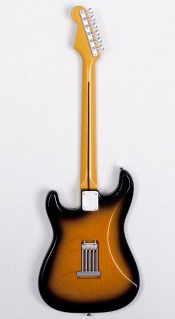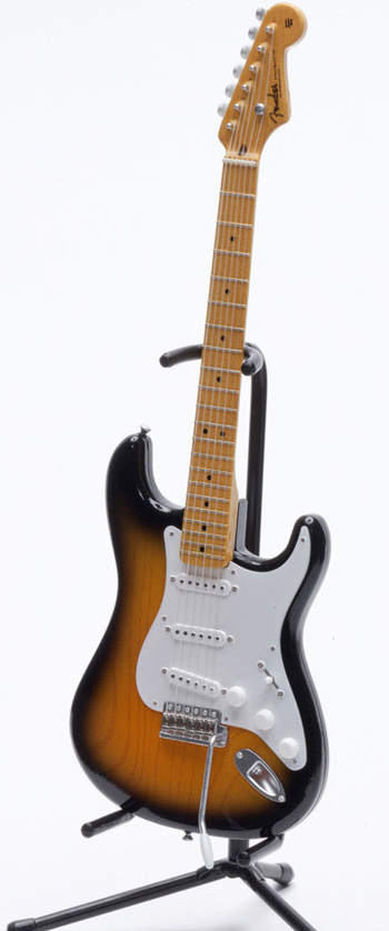 写真を見る限りでは、果たしてこれが実際のギターなのか、1/8フィギュアなのか見紛うほどの完成度の高さ。それもそのはず、アッシュ材特有の大きな木目や、それが透けて見える2トーン・サンバーストのフィニッシュはもとより、ラグビーボール型ピックアップセレクター、ショートスカートと呼ばれるコントロールのノブ形状、3弦が4弦より低く設定されたスタガード・ポールピースを持つピックアップ、丸型のストリングス・ガイドなど、1954年製モデルの特徴が呆れるほど細部に至るまで再現されているのだ。ノブまできちんと再現された1954ストラトは、本当のギターでさえ、 50th Anniversaryのマスタービルダーものしか再現できなかったものだ。ちなみに、1957年製ストラトキャスターはレリック仕様で登場したが、この1954はNOS仕様ということになる。