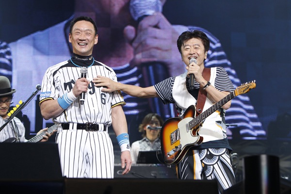 ステージも中盤に差し掛かるあたりで、大阪のご当地ソング「OSAKA LADY BLUES~大阪レディ・ブルース~」のイントロが響くと、会場の雰囲気はさらにハイテンションに。そして、クライマックスはこの曲の間奏部分。もともとこの部分には、プロ野球の実況中継風なナレーションが入っており、そこには「伝統の巨人×阪神戦。ピッチャー桑田、バッター金本……」というくだりがある。この日、ライブでこの部分がくると、なんとステージ上に本物の金本が阪神タイガースのユニフォームを着て登場。桑田がボールを投げ、それを金本自身が打ち返す、というパフォーマンスが繰り広げられたのだから、観客の興奮は止まらない。阪神が優勝を決めた瞬間の甲子園球場を彷彿とさせる熱狂の渦に大阪城ホールは包まれたのだ。