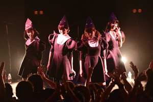 パスピエのパフォーマンスで熱くなった会場をさらにヒートアップさせたのが、新生アイドル研究会ことBiSだ。現在はメンバーのワキサカユリカが一時的にライヴ活動から離脱しているため、4人でのステージとなっている彼女たちだが、ワキサカのパートをあえて誰も補わず、オケで彼女の声を聴かせてしまうところが、いかにもこのグループらしくて微笑ましい。音楽性だけに限らず、やたらと過剰でドラマティックな側面が取り上げられがちだが、実際は本人たちの楽しげなステージングがなによりも魅力的なグループだと改めて感じた。
