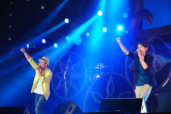 今年、大躍進を遂げたゴールデンボンバーは、この日も大暴れ。「一応、振り付けとかもあるんですけど、自由に楽しんでくださいね。子どもがグズったらお乳をあげるとか」(鬼龍院翔)というMC、さらに喜矢武豊がシャンプーをはじめたり、樽美酒研二がTバック姿を晒したりとやりたい邦題。そして最後は大ヒット曲「女々しくて」で大合唱を巻き起こすなど、独自の芸風をこれでもかと見せつけた。“どんな手を使っても盛り上げてやる”という気合いの高さは完全に振り切れている。