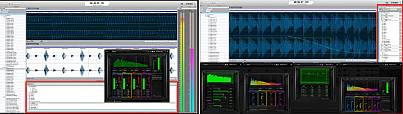 ▲ウィンドウ左のメディアブラウザでファイルを簡単に見つけられるほか、すぐに試聴も可能。メーターは好きな位置に配置でき(右側)、オフライン処理専用パネルからはプラグインのプリセットや検索機能にアクセスできる(写真左)。順序の変更が容易なプラグインチェーンを利用すれば、信号とエフェクトに対する高度な非破壊処理が可能(写真右)。