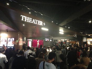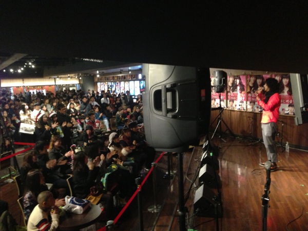 その会場となったのは、博多駅直結の「アミュプラザ博多」9Fにある映画館「Tジョイ博多」ロビー・ステージ。ライブ中にはその模様をUSTREAMで生中継の他、館内に122基設置されたるモニターでも同時中継された。