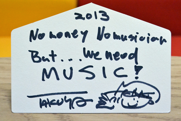 そのTAKUYAから届いた絵馬には、なんとも可愛らしい似顔絵とともに、“We need MUSIC”と大きく書いてくれた。苦しいことがあったときも、逆に嬉ことがあったときも、どちらでも僕たちには音楽が必要なんだという力強いメッセージだ。