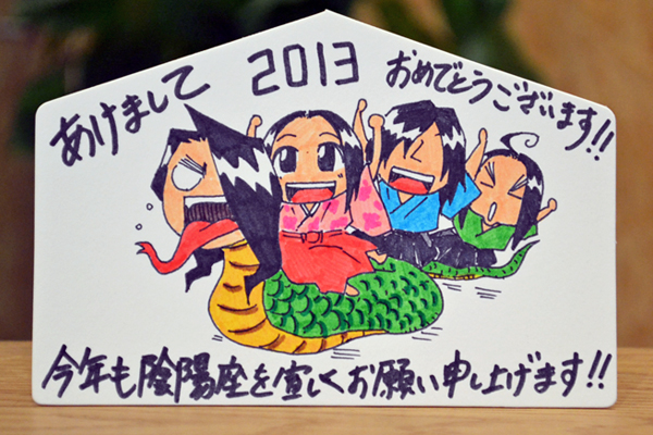 絵馬をご覧いただきたい。黒猫、狩姦、招鬼の表情もさることながら、そのメンバー三人を背中に乗せる瞬火の顔が絶品。もう、このイラストはプロ級だ。