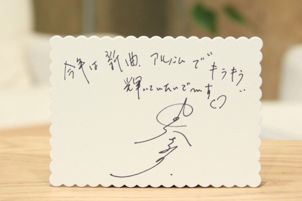 その歌声や佇まいのように美しい字でメッセージをくれた由紀さおりさん。最後の「で~す」もチャーミングです。『第63回NHK紅白歌合戦』での「夜明けのスキャット」も素敵でしたね。そんな由紀さんは、1月30日に松尾“KC”潔プロデュースのニューシングル「愛だとか」を、そして2月27日には、同じく松尾“KC”潔プロデュースによる洋楽カバーアルバムをリリース。ピンク・マルティーニとのコラボレーションで世界的な大ヒットとなった『1969』から1年4ヵ月ぶりとなるこのニューアルバムには、「君の瞳に恋してる」や「オ・シャンゼリゼ」など全12曲を収録予定。キラキラの歌声、早く聴きたいで~す。