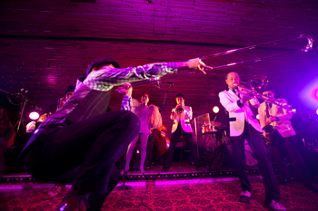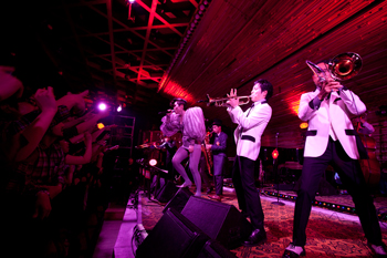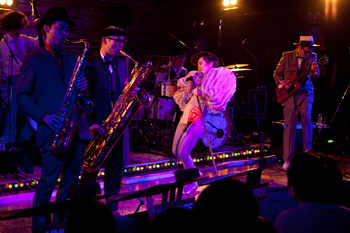 「love scene」からスカタライツの名演で知られる「Adorable You」のカバーとスカ色の強い2曲で盛り上げたところで、中納が「なんか兄サンたちが大阪でライヴやったらしく。呼んでもエエかな……カモン! スカパラホーンズ!」とコールすると、なんとお馴染みの白いスーツに身を包んだ東京スカパラダイスオーケストラのGAMO、北原、NARGOが登場! 3人が加わったスペシャルな編成で中納が参加したスカパラの「黄昏を遊ぶ猫」を演奏すると、そのまま怒濤の7ホーンズで「くちばしにチェリー」へ。フロアからは自然とコール&レスポンスが巻き起こり、スカパラホーンズとミッドナイトホーンズが繰り広げた強烈なソロバトルも圧巻だった。