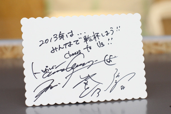 TRIPLANEのみなさんからは、「Cheers to Us!!」というメッセージをいただきました。お正月休みは友人たちとの再開など、乾杯した人も多かったことでしょう。そして2013年、いろんな喜びをみんなで分かち合い、乾杯できるといいですね。