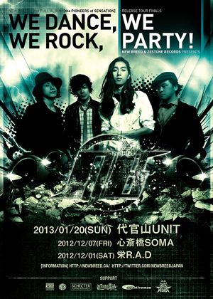 その中でも早くからエレクトロニカを導入し独自のサウンドを作り上げてきたパイオニア的存在のバンド“NEW BREED”が、自身のアルバムリリースツアー<We Dance, We Rock, We Party!>で、若手の注目バンドをゲストに迎えたツアーを敢行中。すでに大阪、名古屋公演を完売のうちに終了、各地に「熱」を起こしている。