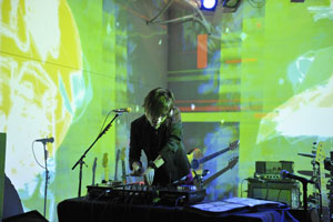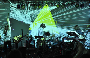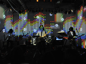 そして、2.5Dスタジオは、Applicat Spectraの音色と、この日のVJを務めた吉田恭之が生み出す映像との美しい融合で染められる。刹那に消えるセントエルモの妖精、空を翔ける猫は気まぐれ……。オープニングナンバー「セントエルモ」の歌詞をそのまま視覚化するかのごとく、ステージ上の3面プロジェクターには幾線も連なる色鮮やかな光の筋が映し出され、その光線が重なって生まれた猫が空間を翔ける。「こうやって背景の映像を3人のクリエイターの方に作ってもらって、本当にその3人の才能に感謝しています」。ナカノシンイチ(Bass / Vocal / SamplingPad)は、前述の吉田恭之と、これまでの2回で共演したGraphersRockとUKYO Inabaの3人の映像作家陣への感謝を贈り、この<Netscapes>ならではの音楽と映像のスペクタクルを展開していく。
