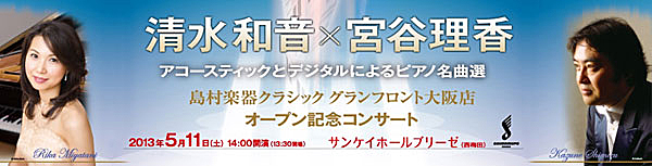 島村楽器の店舗としては最大のクラシック専門店が、JR大阪駅直結のグランフロント大阪(4月26日グランドオープン)内に出店する。この出店を記念して、国内外で広く活躍しているピアニスト2人を招き、オープンの翌々週となる5月11日にサンケイホールブリーゼ(西梅田)でコンサート「清水和音×宮谷理香 アコースティックとデジタルによるピアノ名曲選」を開催する。