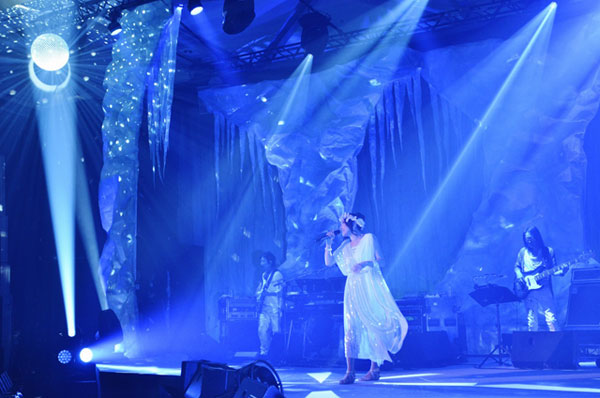 今年2013年のテーマは“氷の世界”ということで、“未来の氷河期”を連想させる時空を超えたファンタジックな世界感はユーミンならでは。氷河期の洞窟の中にステージが出現したイメージのセットに、音と照明によってその氷の洞窟が様々な表情を見せる演出。
