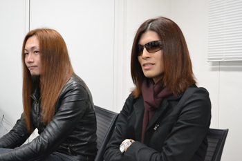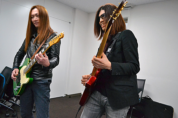 この「ロックスミス」に今回チャレンジするのは、摩天楼オペラのギタリストAnziとドラマーの悠。悠はドラマーだが、個人的にギターも弾くということでの参戦となった。ゲーム開始前よりギターを抱え指慣らをしつつ「ぜんぜん弾けないですよ」と笑う悠と、自身のギターを持ち込んだAnziがプレステの前にスタンバイ。いよいよプレイスタートだ。今回はダウンロード配信曲もすべて揃った状態で、約150曲がスタンバイしたプレステ3を用意。