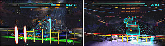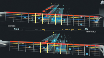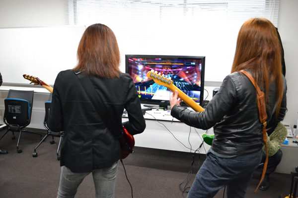 なお、今回は短時間でのプレイということで、あらかじめゲームの概要を2人に説明。難易度がプレイヤーに合わせて自動的に調整されること、多くのコードやテクニックがビデオで解説され徐々に覚えていけること、フレーズ単位での繰り返しやミニゲームなどの練習メニューが多数用意されることなど、本来ならゲーム内で段階を経て知っていくところを駆け足で解説し、本編のギター・プレイに突入することとなった。