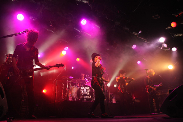 18時10分。ライブは幕を開けた。いつもはオープニングVTRからのスタートなのだが、この日は、ediee(G)の影アナからの幕開け。ライブのノリ方の説明や、注意事項を彼らしくアレンジし、会場の笑いを誘っていた。アットホームな時間が流れる中、SEが流れ、elsa(Dr)、ediee、dunch(B)、がステージに現れ、hideki(Vio&Dance)、haderu(Vo)がステージに揃うと、彼らは1曲目にとっておきのヘヴィナンバー「積極的受動人間」をぶつけたのだ。
