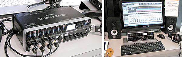 ▲アナログ入力は前面に4(XLR/TRSコンボ)、背面にコンボ×8とフォーン×4。出力はフォーン8とXLRのモニターアウトを装備。12のXLR入力端子はファンタム電源対応。デジタル入出力も備える。レベルメーターによる入力レベルの視認性も抜群だ。展示はDAWソフトのSONAR X2とともに(写真右)。SONAR X2のタッチパネルによる操作と合わせて、非常に使いやすいシステムが構築できる。