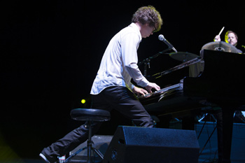 「ニホンガスキデス」というベンの一声で始まった「フィロソフィー」以降のエネルギッシュな終盤はこのバンドの真骨頂。もちろん、「フィロソフィー」後半ではガーシュウィンのあのリフも飛び出して、ベンも座って弾いてなんていられないとばかりに前のめりに鍵盤に向かう。ダレン→ロバート→ベンとリード・ヴォーカルのバトンが渡されて始まった「アンダーグラウンド」で場内の興奮は頂点に。アンコールでは<カネヲカエセ オレニカエセ>でお馴染み「ソング・フォー・ダンプト」で大団円。最後まで日本のオーディエンスのために…という3人の心配りが隅々にまで行き届いた、それでいてダイナミズムや攻撃性も忘れない素晴らしい2時間だった。